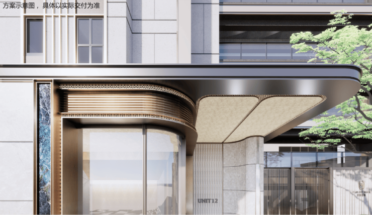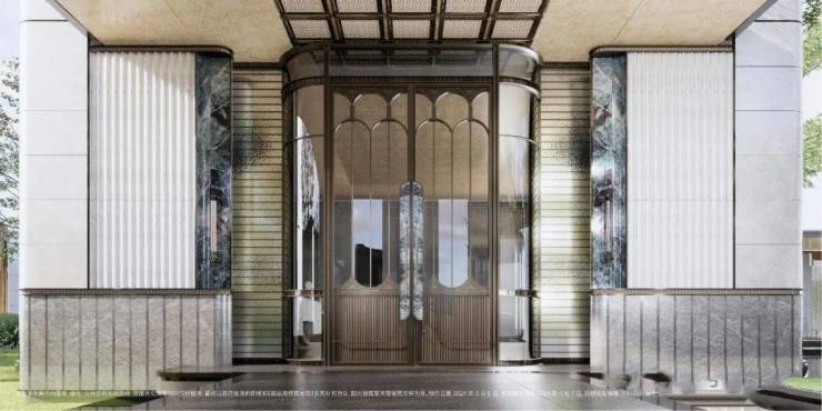 在楼栋主进口相同运用石材+弧形铝板等元素,一起还有格栅装修,质感提高显着: